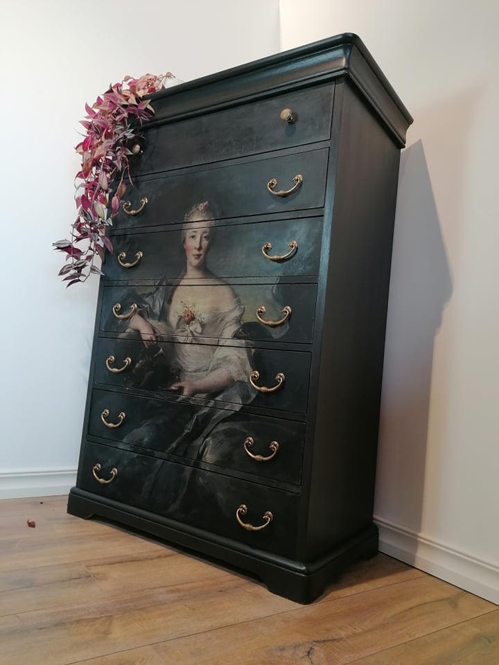 Mahukas kõrge kummut puidust tugevate täispuidust sahtlitega. Lisatud dekupaaž- tehnikas pilt. Korpus lakitud, sahtlid vahatatud.