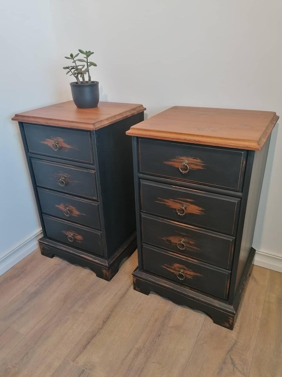 Kaks uue viimistluse saanud öökappi. Piimavärv, õli, vaha, pealsed lihv, peits + mattlakk.