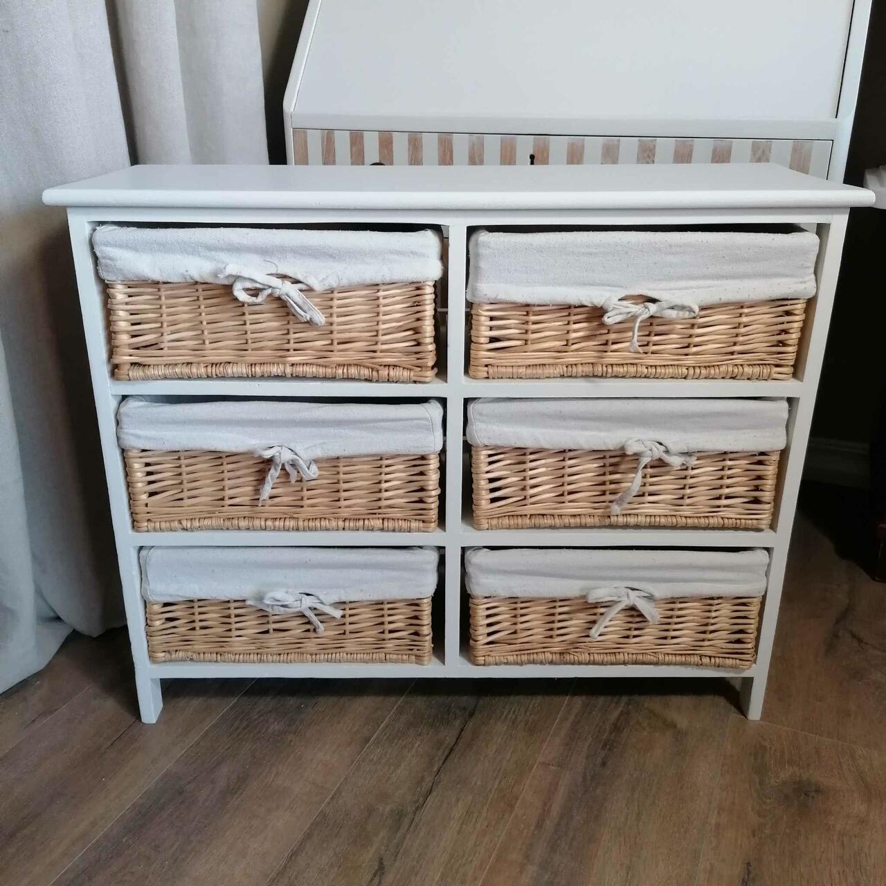 Kergest puidust kasutatud riiul. Korpus saanud lihvi ja uue värvi. Kõik kuus korvi terved, linased tekstiilid puhtad, vaid ühel väike värviplekk, mis pesus välja ei tulnud, pilt lisatud.
