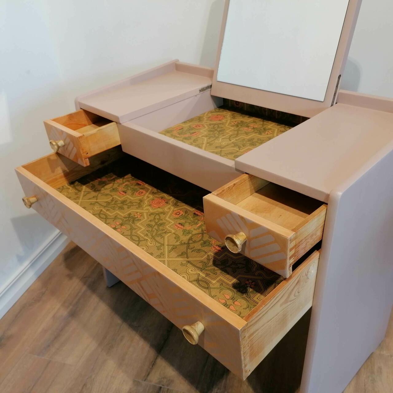 Kiftid täispuidust sahtlid kombinatsioonis ülestõstetava peeglialuse laekaga mahutavad kogu naisterahva ilu-arsenali. Visuaalse müra vältimiseks saab kõik kiirelt kokku lappida ja peitu panna. Originaalnupud on kirsiks tordil. :)