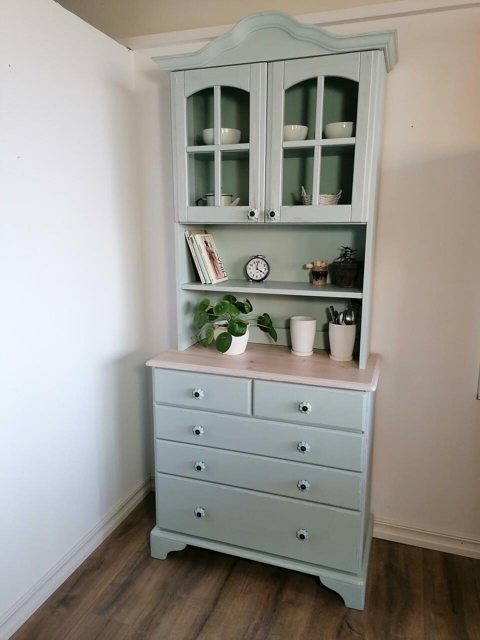 Männipuidust vitriinkapp, värvitud, kergelt vanandatud ja lakitud. Värv õrn pardimuna, toon-toonis keraamilised käepidemed. Tööpind valge peits + lakk. Mahukad täispuidust sahtlid.