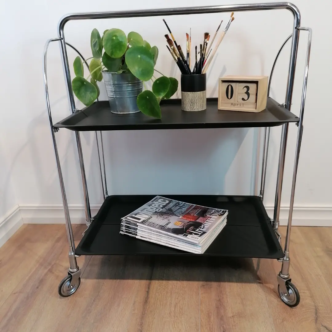 Nõuka-aegne serveerimislaud sai tänasesse päeva aidatud sitikmusta värvi abil. Metallosa ja rattad olid niigi heas korras. Praktiline abiline pidude puhul.